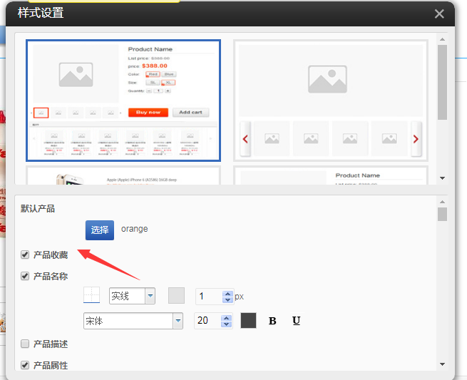 ①.以pc营销版为例,选择产品详情,在样式设置中开启收藏功能,可以看到图片下方增加了收藏按钮。