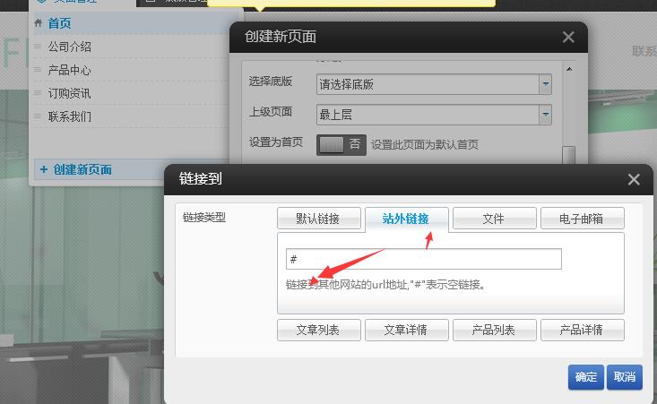 在页面管理中找到产品中心然后点击属性-》选择设置链接