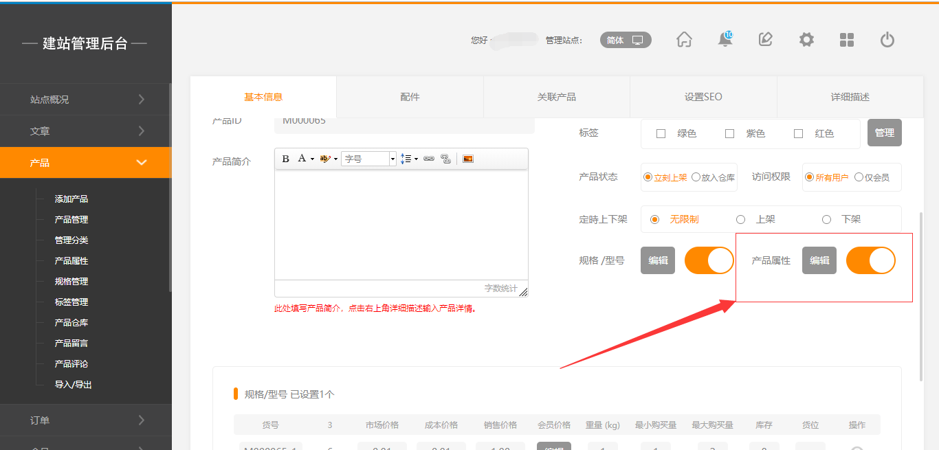 产品和文章数量均未作限制,实际数量受产品和文章的素材内容大小影响,建议产品和文章的总数量不超过5万个。超过可能会影响后台加载速度,严重情况下可能出现异常。以下以营销版为例本小节共包含5点。1、依次点击 产品-》添加产品 2、商品应该包括那些内容呢?可能最基本的应该是以下几点:商品类别:一件商品必须属于一个类别,这个便于管理所以可能添加分类往往是第一步的。商品名称:一件商品当然也是必须有这个商品的名...